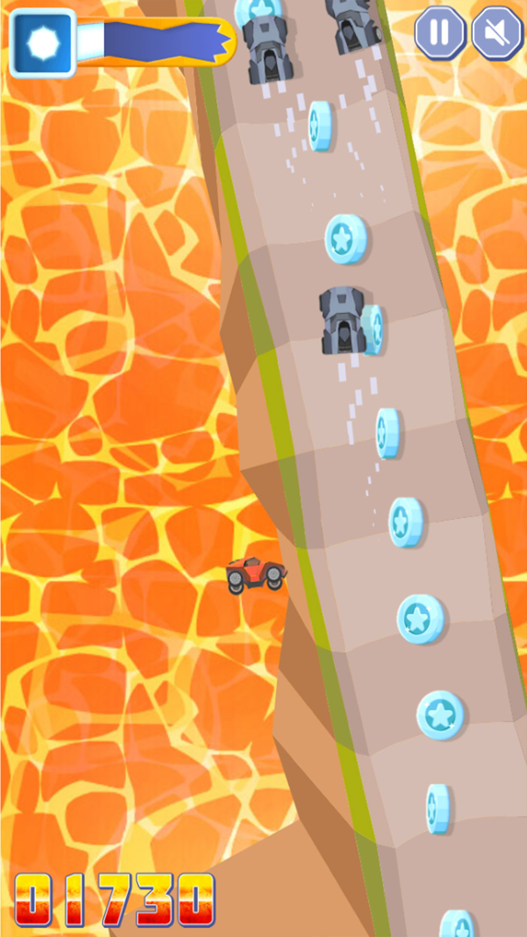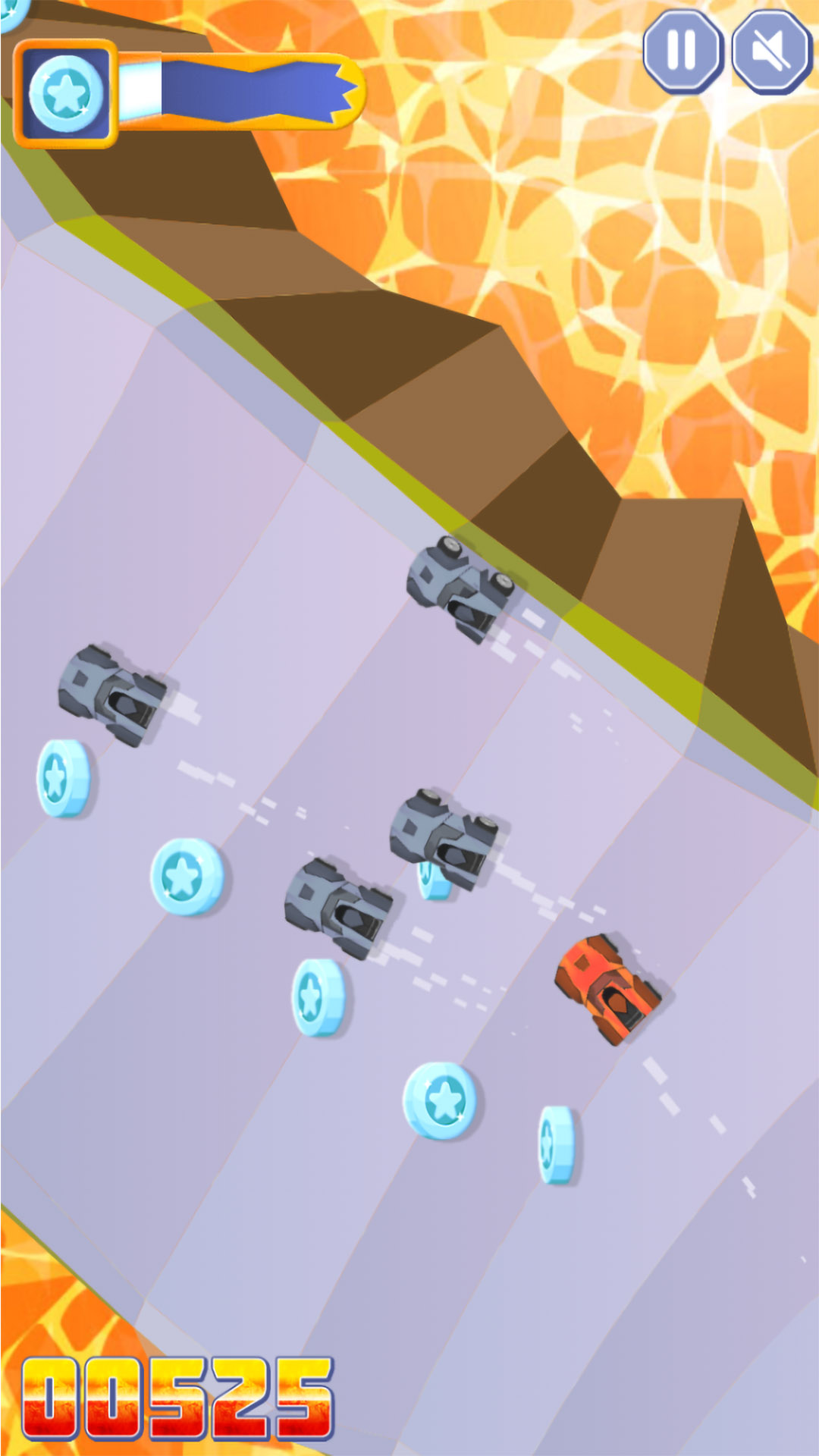 Fast paced survival action racing game with a unique generated track for each run. Dash, destroy and blaze through multiple opponents on the winding cliff road and try not to get knocked off! The further you go, the more upgrades you will earn. Tap left and right to steer. Collect power-ups to blast your opponents out of the way. Complete long runs to earn upgrades.