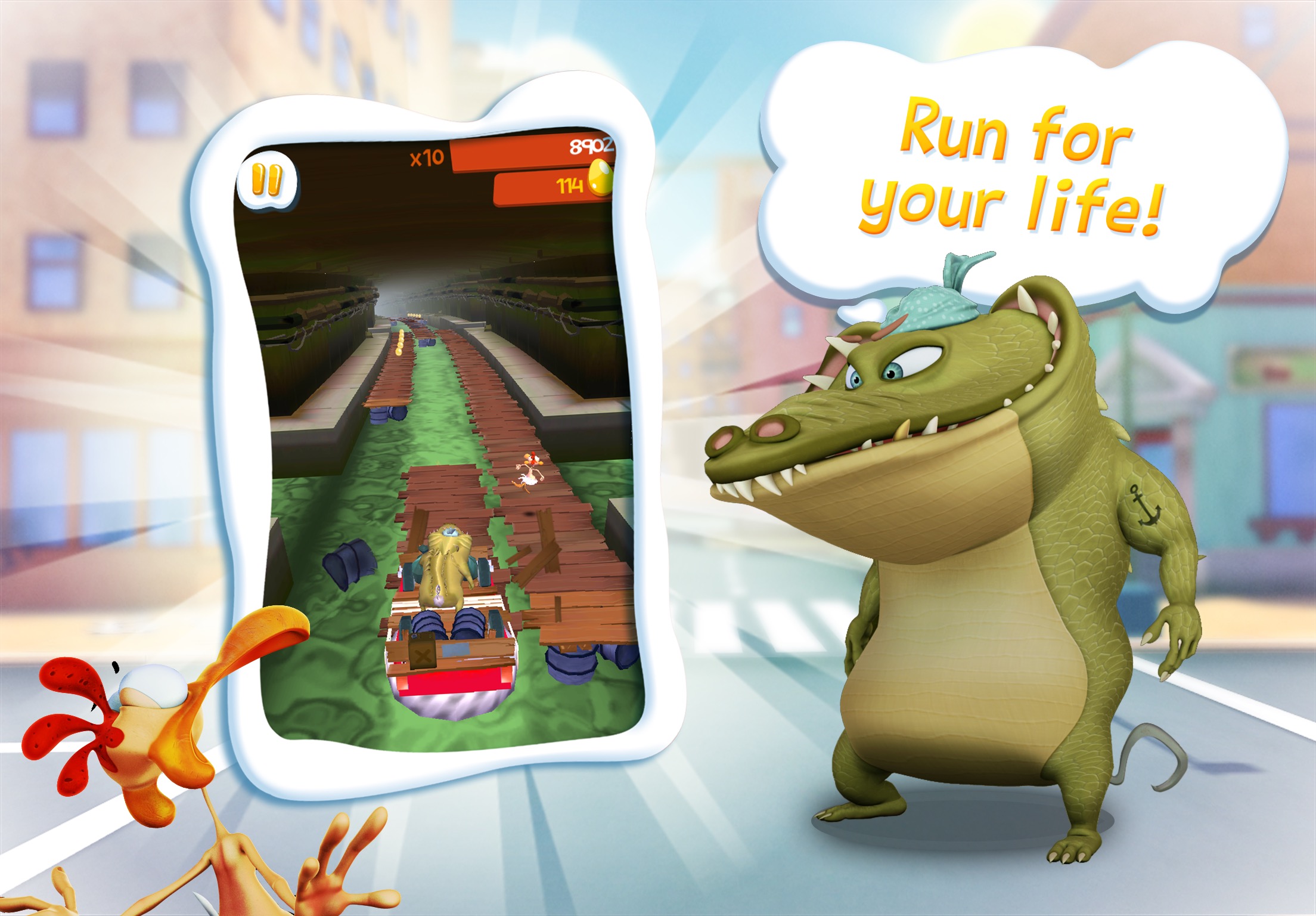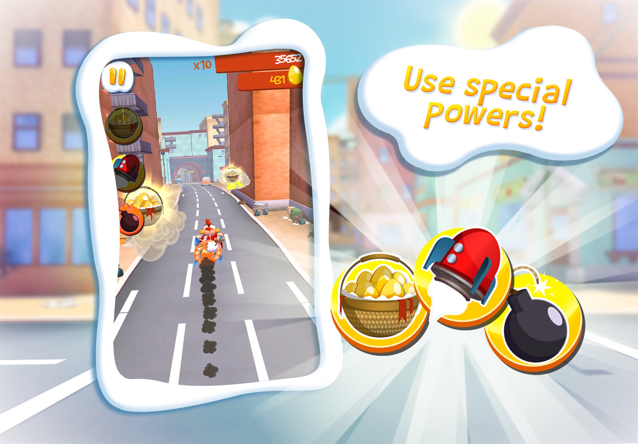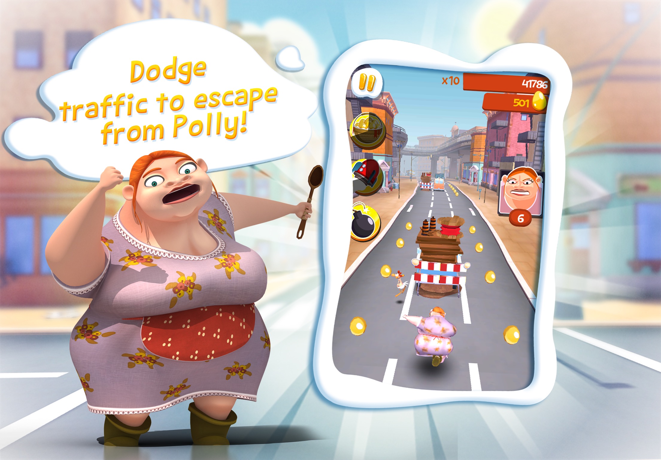 One egg a day keeps the crazy lady away! Run away from Polly to stay alive. Speed up, fly away, throw some dynamite at her, or hide in the sewers but be careful, the sewers are full of crocodiles! Not kidding! The legend is true! • Escape the angry Landlord Polly and the hungry Crocodile using your skills, reflexes, bombs, rockets and more. • Unlock and upgrade powerful items that will help you reach new limits. • Dodge traffic and prove you are up to the challenge in this frenetic runner.